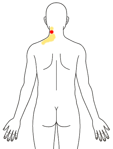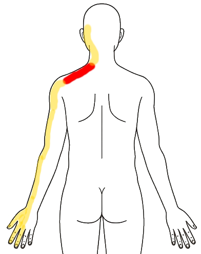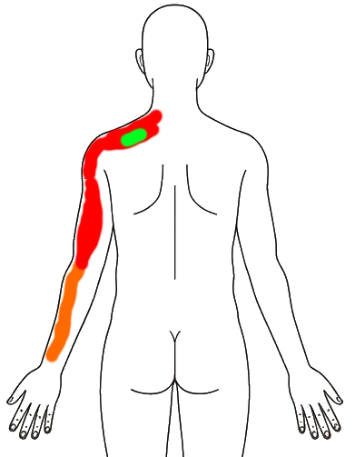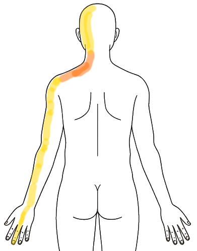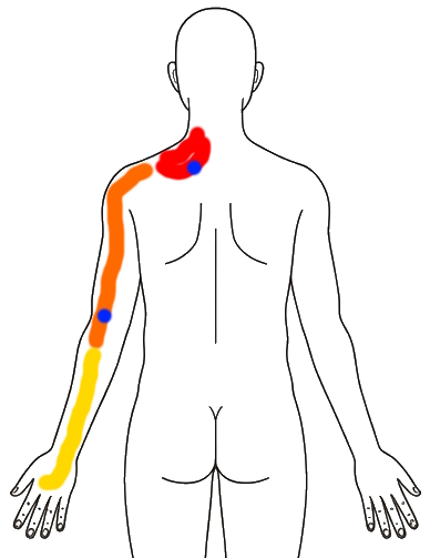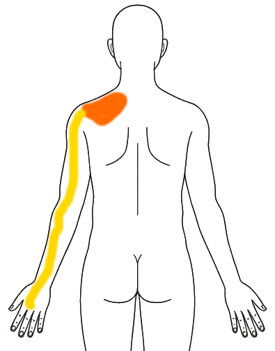 痛みの範囲が少なくなってる。(下図)首、肩甲骨辺のポイント、上腕は痛いが背中側はあまり痛くない。